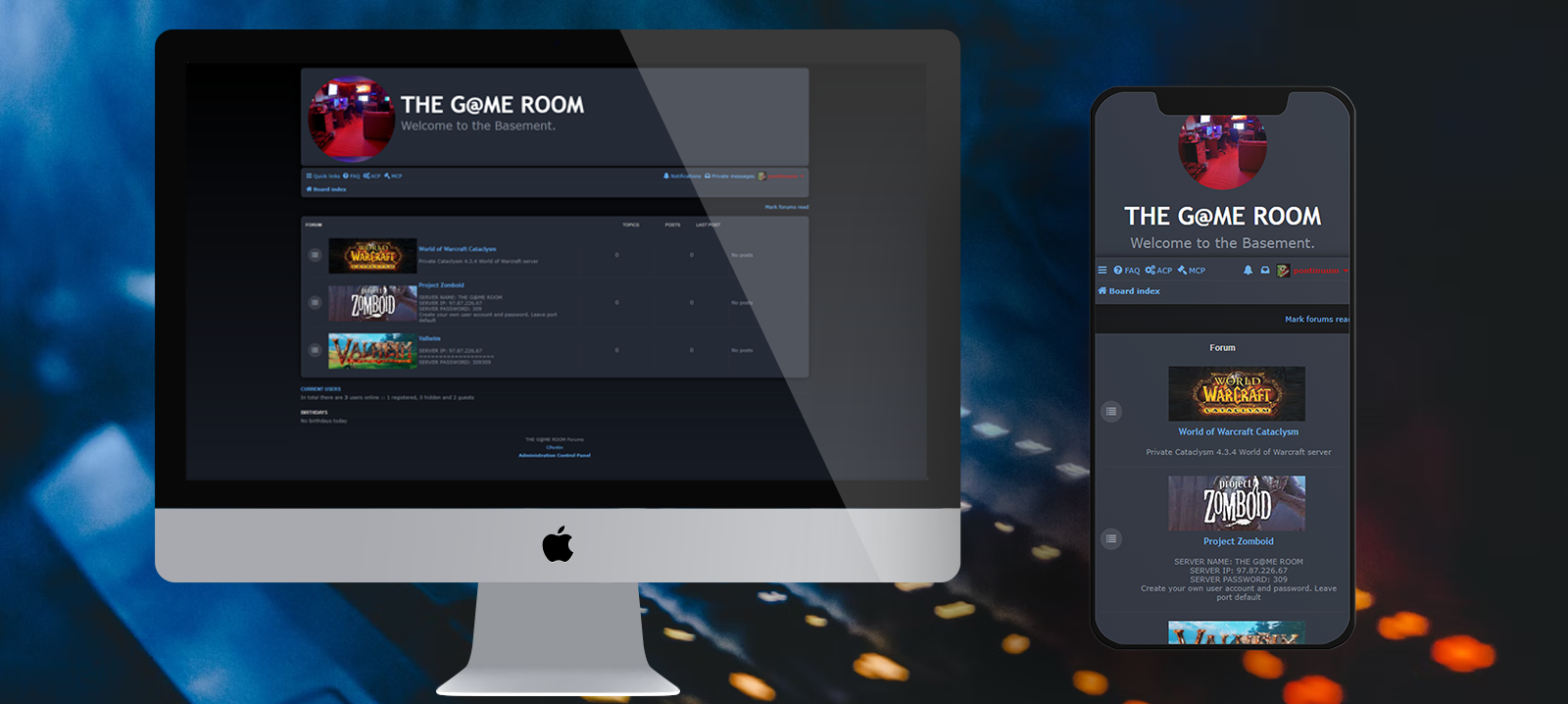 THE G@ME ROOM is an online forum I set up using phpBB software and have customized personally to match our Steam Gaming Group. This forum serves as an online community where friends and family members can gain access to dedicated server credentials and game file downloads for all of our dedicated private game servers. Access to the forums is locked behind a login, however once logged in, a member will have access to all of the current game files and information. Registration is open, but all newly registered accounts must be personally approved by me.