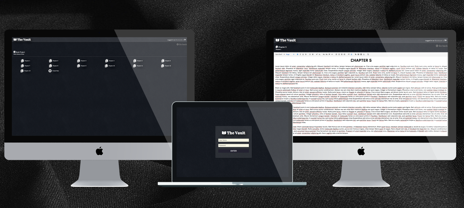 The Vault is an online writing and organizational tool that allows users to create documents and other written works and assign them into categories. Authors can create custom categories for their works and assign them with a type and genre. All progress is saved automatically to the cloud, ensuring that no work can ever be lost.